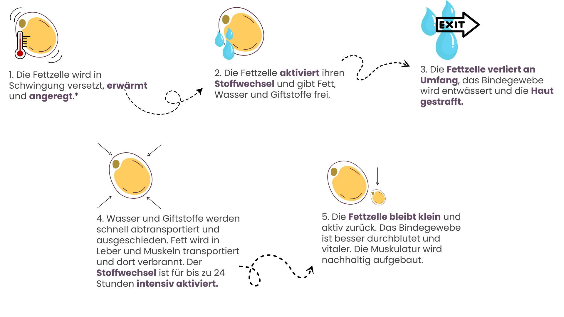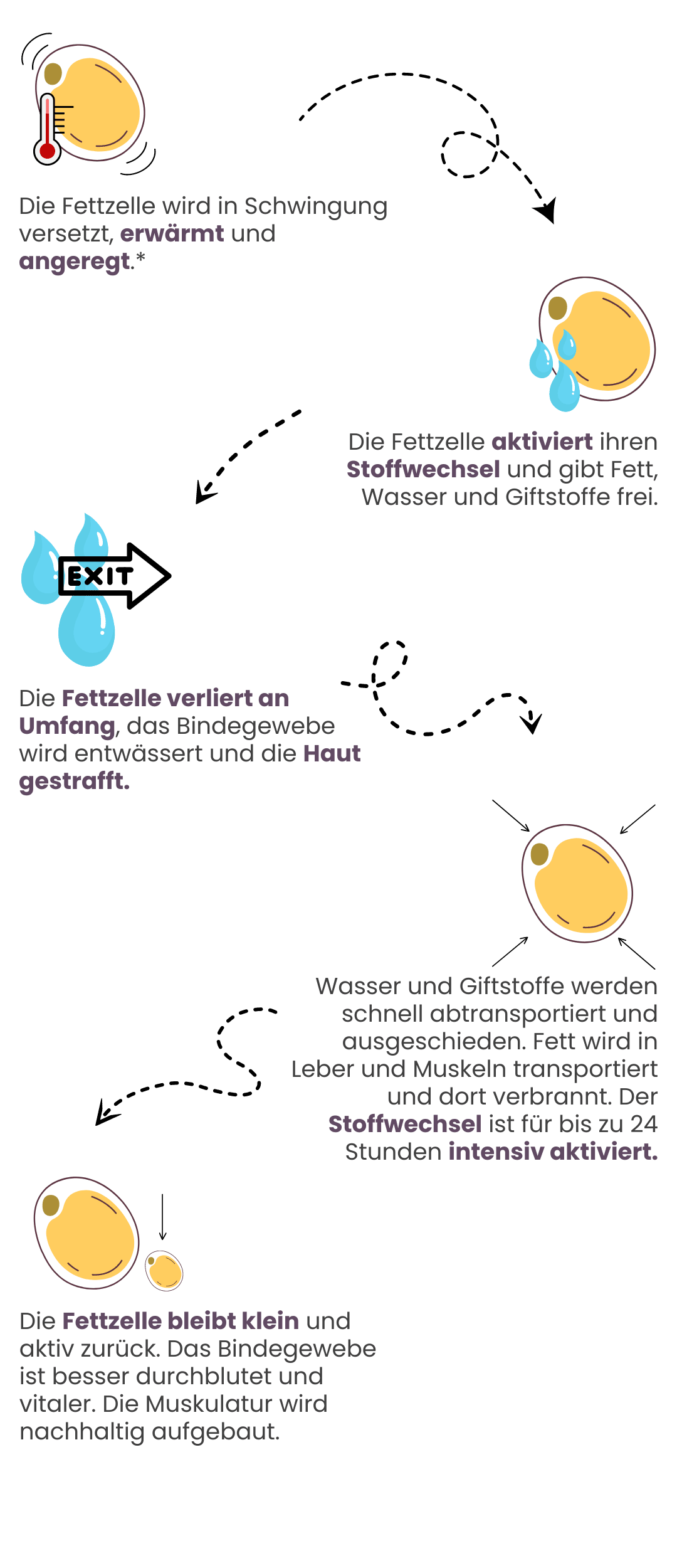 *Achtung! Die Fettzelle wird weder verletzt noch zerstört. Lediglich der Stoffwechsel der Fettzelle wird "aufgeweckt", damit der natürliche Fettabbau wieder ablaufen kann. Die Darstellung der Fettzelle dient ausschließlich der einfachen bildlichen Veranschaulichung. Eine Gewichtsreduktion auf der Waage setzt eine dafür geeignete Ernährung voraus.